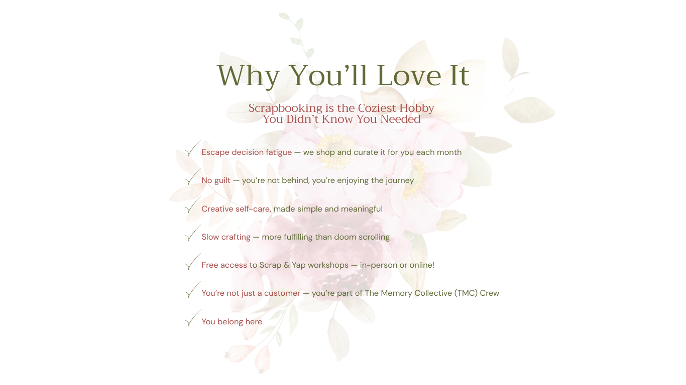 The Memory Collective Club is a scrapbook subscription designed to make memory keeping feel simple, calm, and doable again. Each curated kit helps you slow down, reconnect, and relive life’s most meaningful moments — one page at a time.